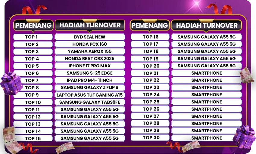 - Peringkat dihitung berdasarkan akumulasi TURNOVER SLOT di periode bulan sebelumnya dan perhitungan TurnOver dimulai dari tanggal 1 pada pukul 00:00 WIB dan berakhir pada pukul 23:59 di Akhir Bulan